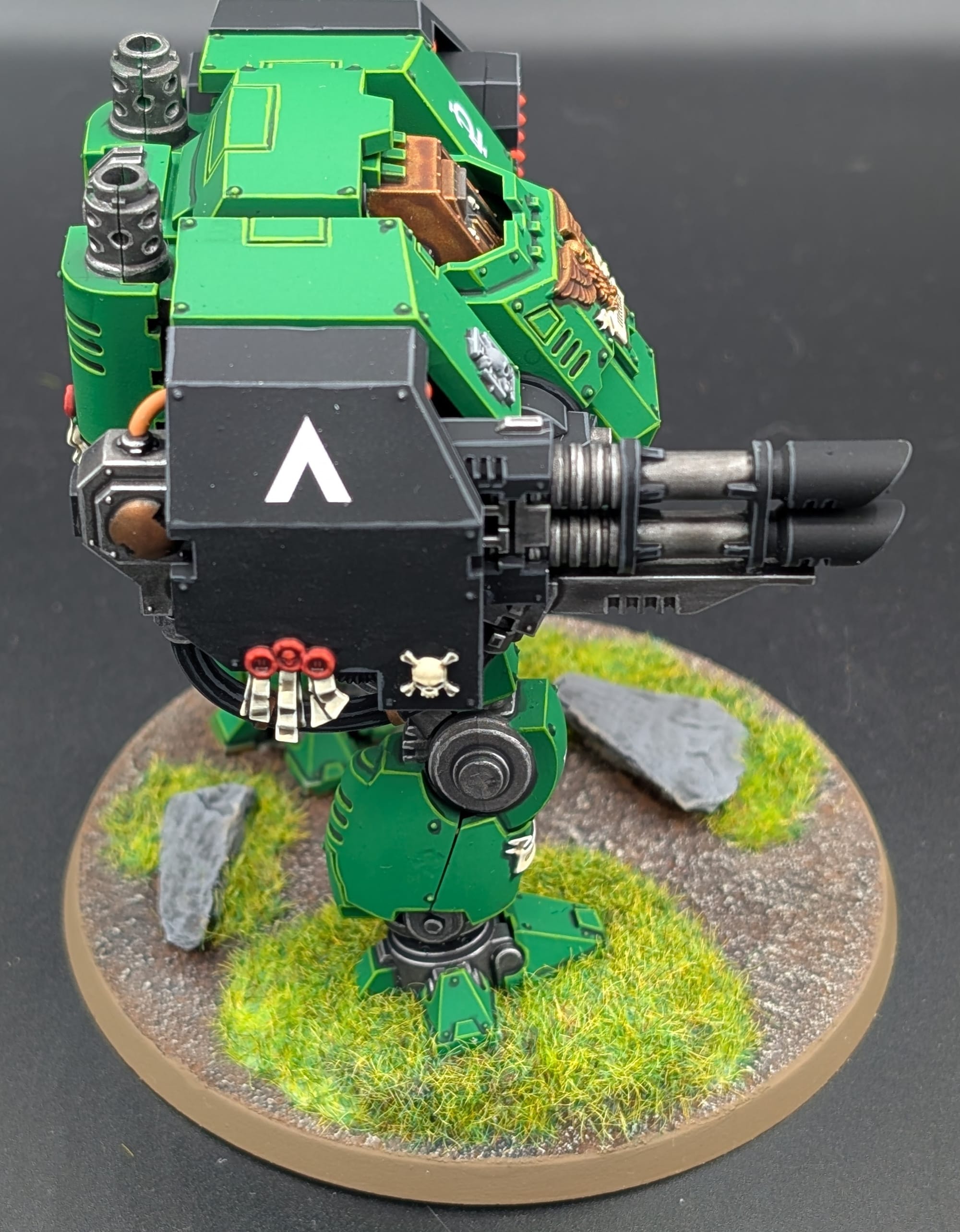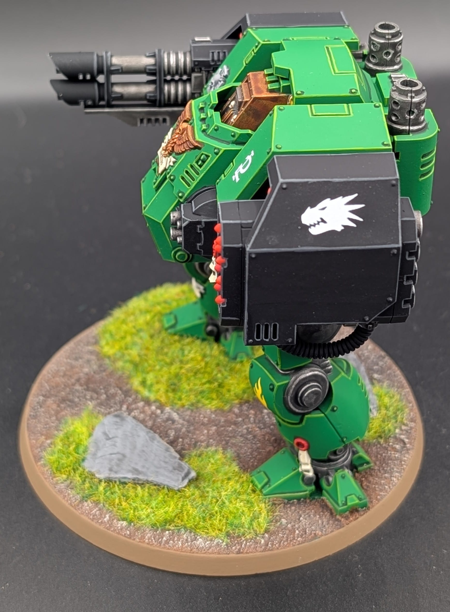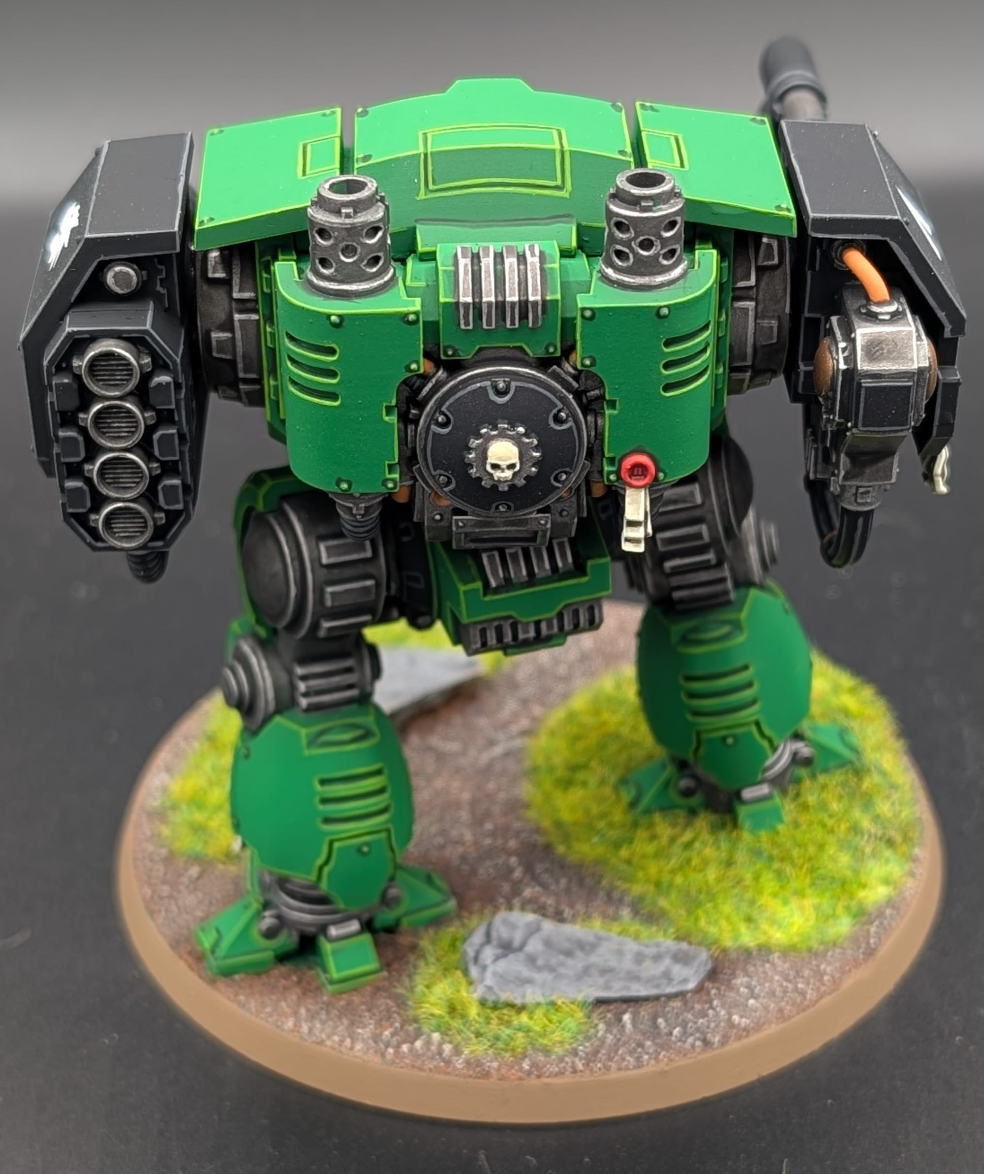 Compared to my first dreadnought that was all green with no exceptions, this chap has blocked out shoulder pads. This succeeds in two things - it makes him visually distinct, and it allows for my opponents to point at him and kill him without confusing him with his green brother.
