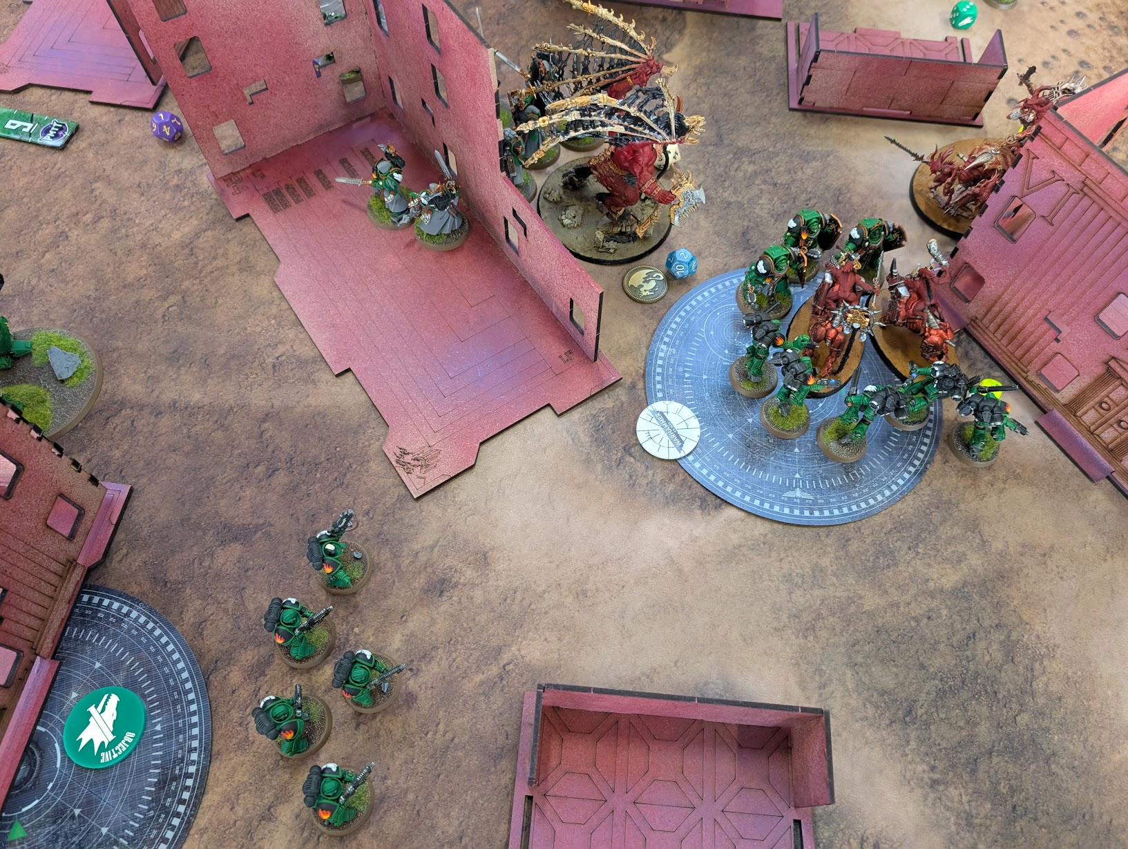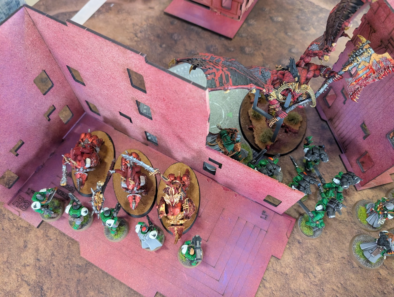 Things almost immediately went wrong as Ryan launched his Bloodthirster like a cruise missile into my deployment zone. Things went from bad to worse, as I got too high on my own supply with the Lion, and proceeded to Rapid Ingress him into heroic intervention range to protect my Jump Pack Intercessors.